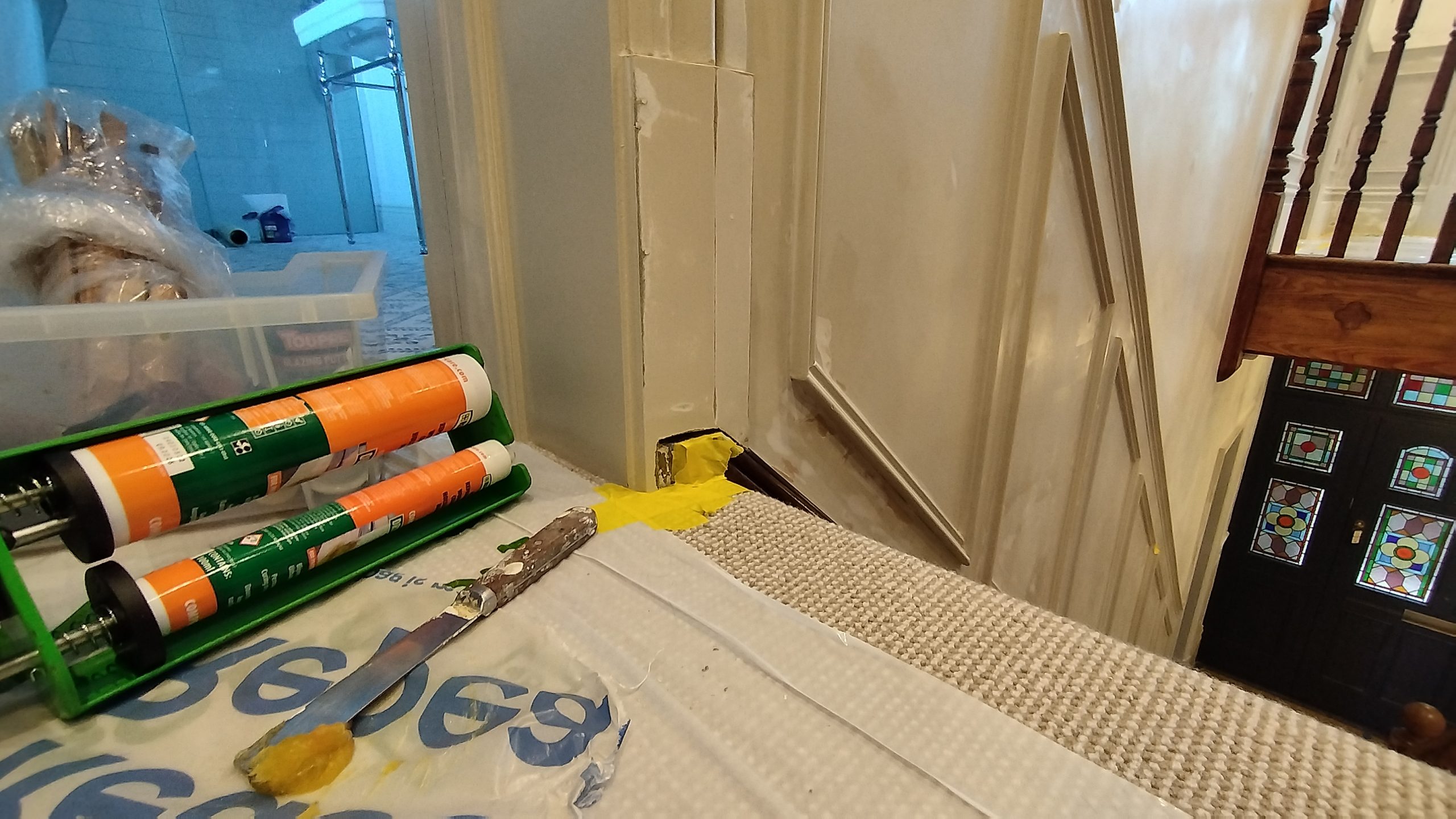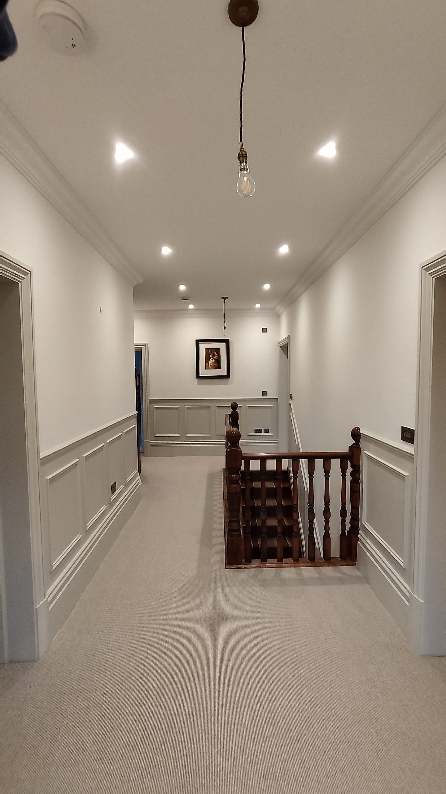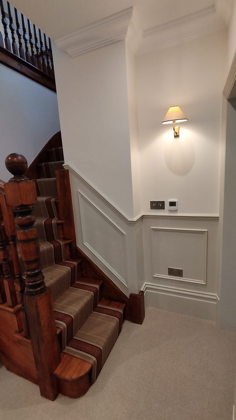 This Hall, Stairs & Landing was subject to a complete full refurbishment by Us. The Works involved the extensive removal of a subpar legacy paint finish on all of the panelling, trim and walls using dustless sanding equipment. All Wall panelling and Wood Trim surfaces were appropriately prepped and cleaned prior to paint spraying for a professional high end finish. Ceilings were then refurbished where necessary before being repainted, followed by painting of the walls to finish. Here at Vitality Creation Decor, we take great pride in Our Work and ensure that a first class professional service is provided for. Please see our latest reviews and do get in touch if you would like support from Us with transforming your living spaces.
